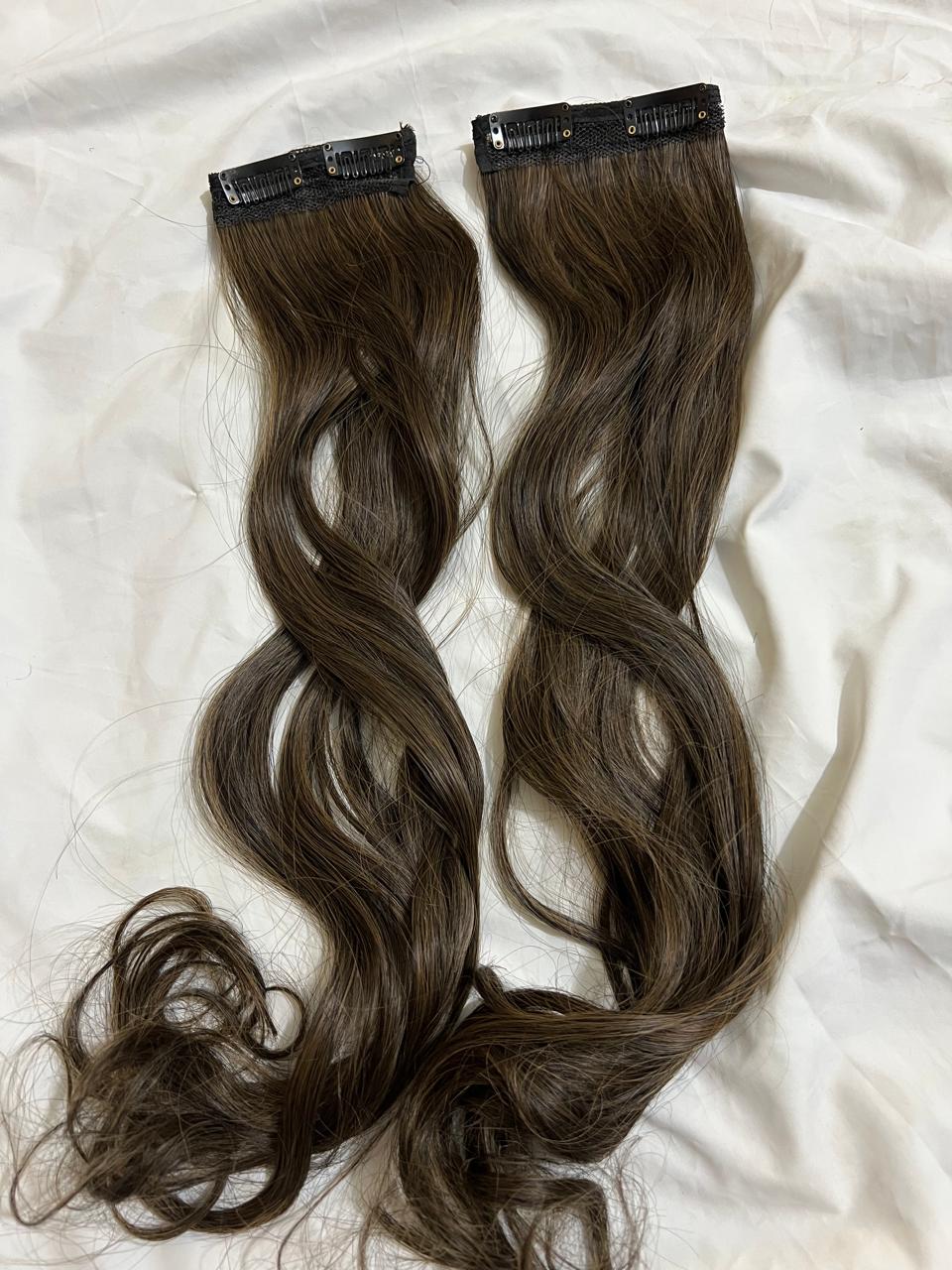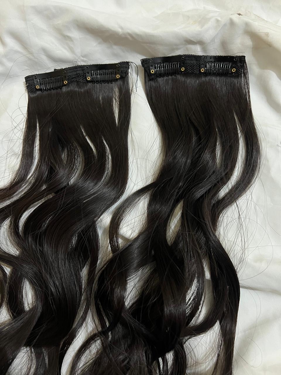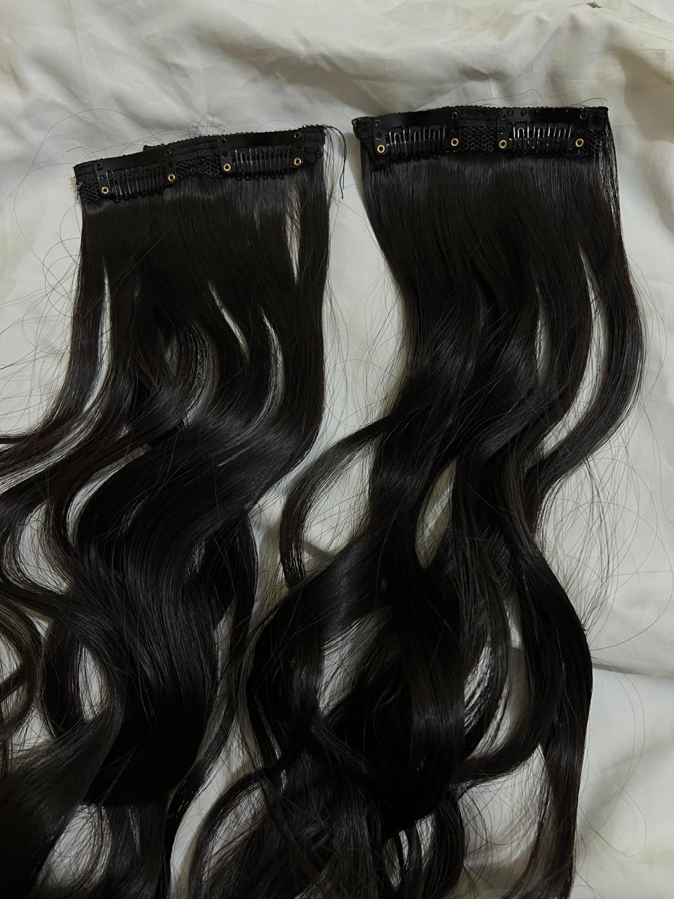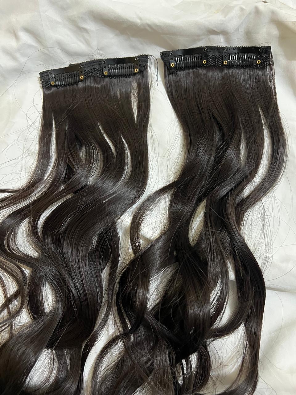 "Usually refers to hair extensions that are attached to your natural hair using clips or clips-in extensions. These are a popular and convenient way to add length, volume, or different hairstyles to your hair without the need for permanent bonding methods like glue or sewing. Clip-in hair extensions typically come in wefts or strips of hair that have clips attached to them. You can open the clips and snap them onto your natural hair, close to the roots, to secure the extension in place. They are easy to apply and remove, making them a temporary and non-damaging option for hair enhancement."